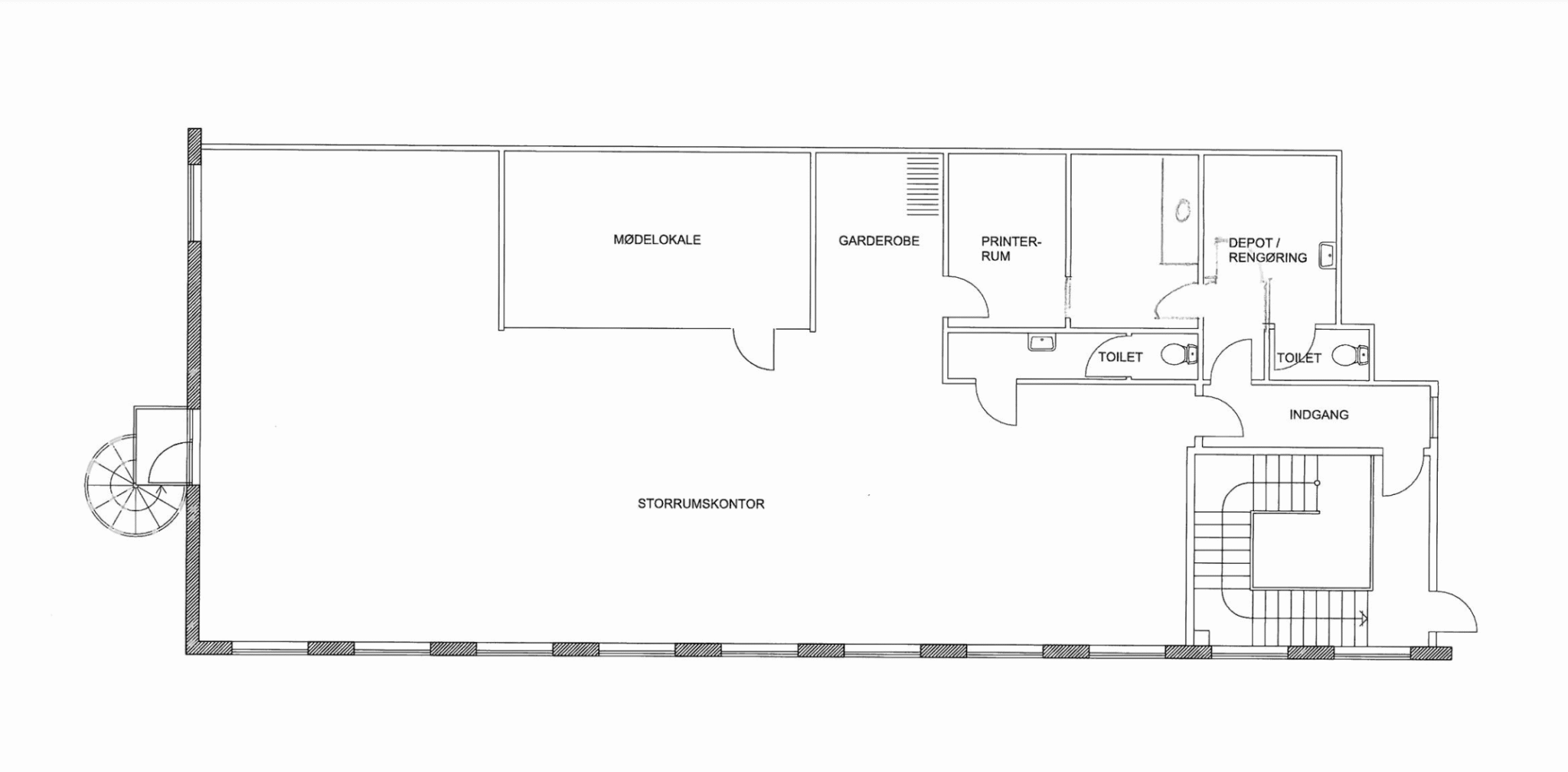 Kontoret er opdelt i storrumskontor, mødelokale, printerrum og spiseområde.