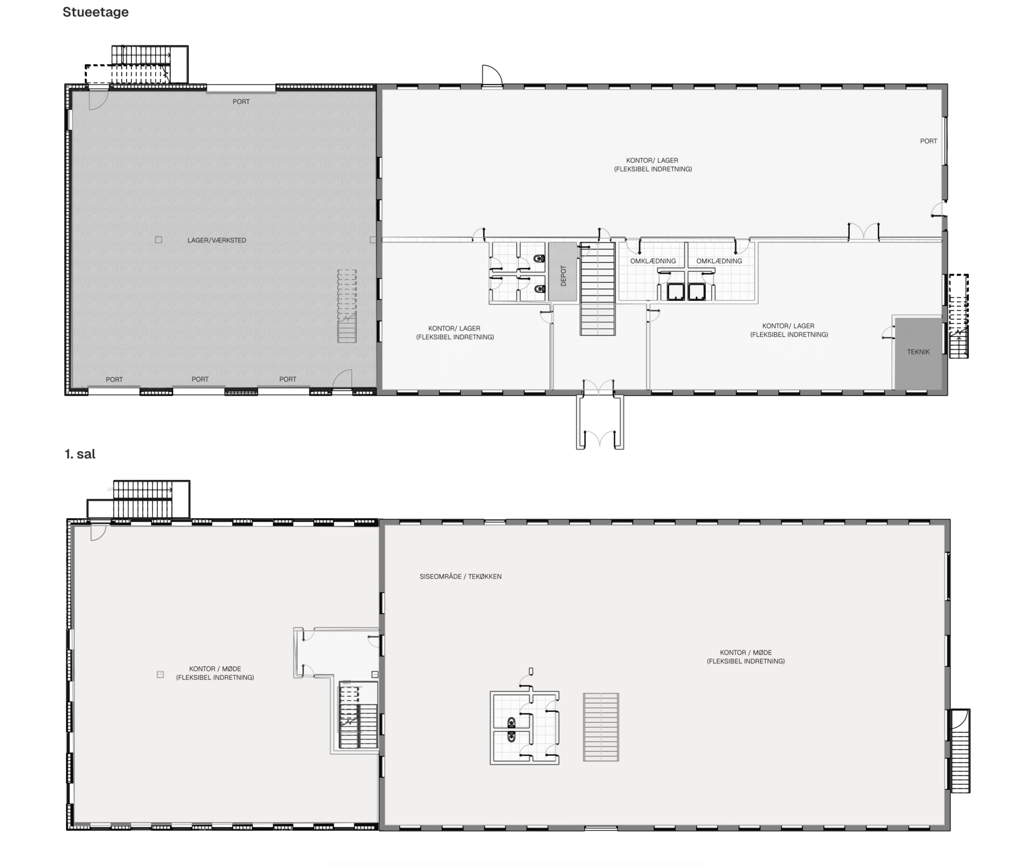 Førstesalen kan indrettes med moderne kontorer, mødelokaler og spiseområde, og der kan etableres nye bade- og omklædningsfaciliteter. På 2. salen på ca. 40 m² etableres et helt nyt fællesrum, møderum eller kantine – afhængig af lejers behov.